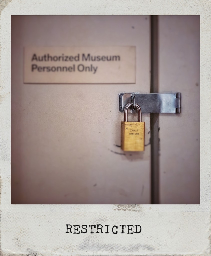 is it innate to human nature to want to know what is behind a closed door, in a locked file, beyond a chained gate? the phrase, “none of your business,” makes us curiouser, sometimes to the point of illegal entry. i had no interest in this door or what was behind it until i saw the sign and the added-later lock and hasp. what had been just a somewhat grimy, nondescript door in a passageway between galleries took on elevated importance. what was back there that needed to be protected by a hastily installed hardware store purchase? not that i would ever check; not so much that i have a profound respect for “none of your business,” as much as it is i’ve got the experience to know that imagination will most often create a much better story than any truth that’s being protected.
