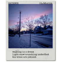 the streetlight highlights . snow covered branches, showing . what it watched last night the source of light that is the inspiration for the photo is a streetlight that is still glowing as the sun rises. knowing this doesn’t detract